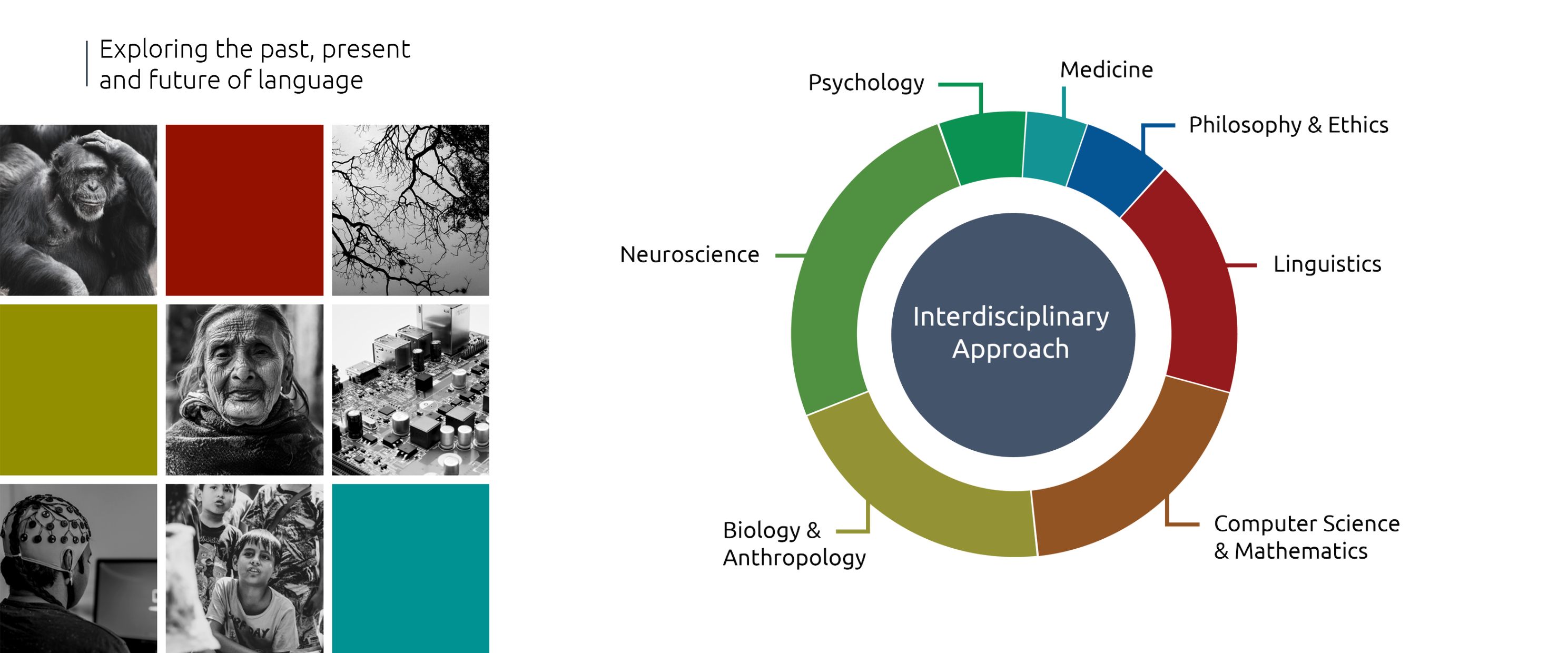 The Swiss National Centre of Competence in Research (NCCR) Evolving Language is a nationwide interdisciplinary research consortium bringing together research groups from the humanities, from language and computer science, the social sciences, and the natural sciences at an unprecedented level. Together, we aim at solving one of humanity’s great mysteries: What is language? How did our species develop the capacity for linguistic expression, for processing language in the brain, and for consistently passing down new variations to the next generation? How will our capacity for language change in the face of digital communication and neuroengineering?